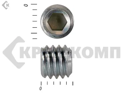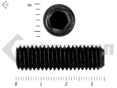 Винт DIN 913 установочный с внутренним шестигранником и плоским концом. Конец установочного винта имеет специальную форму, служащую для фиксации изделий относительно друг друга. Для передачи крутящего момента винт установочный din 913 имеет внутренний шестигранник. Этот вид ключа позволяет приложить большое усилие к винту, поэтому установка производится максимально прочно и надежно. Винт имеет полную метрическую резьбу и по своим характеристикам является аналогом стандартов ISO 4026 и ГОСТ 11074.